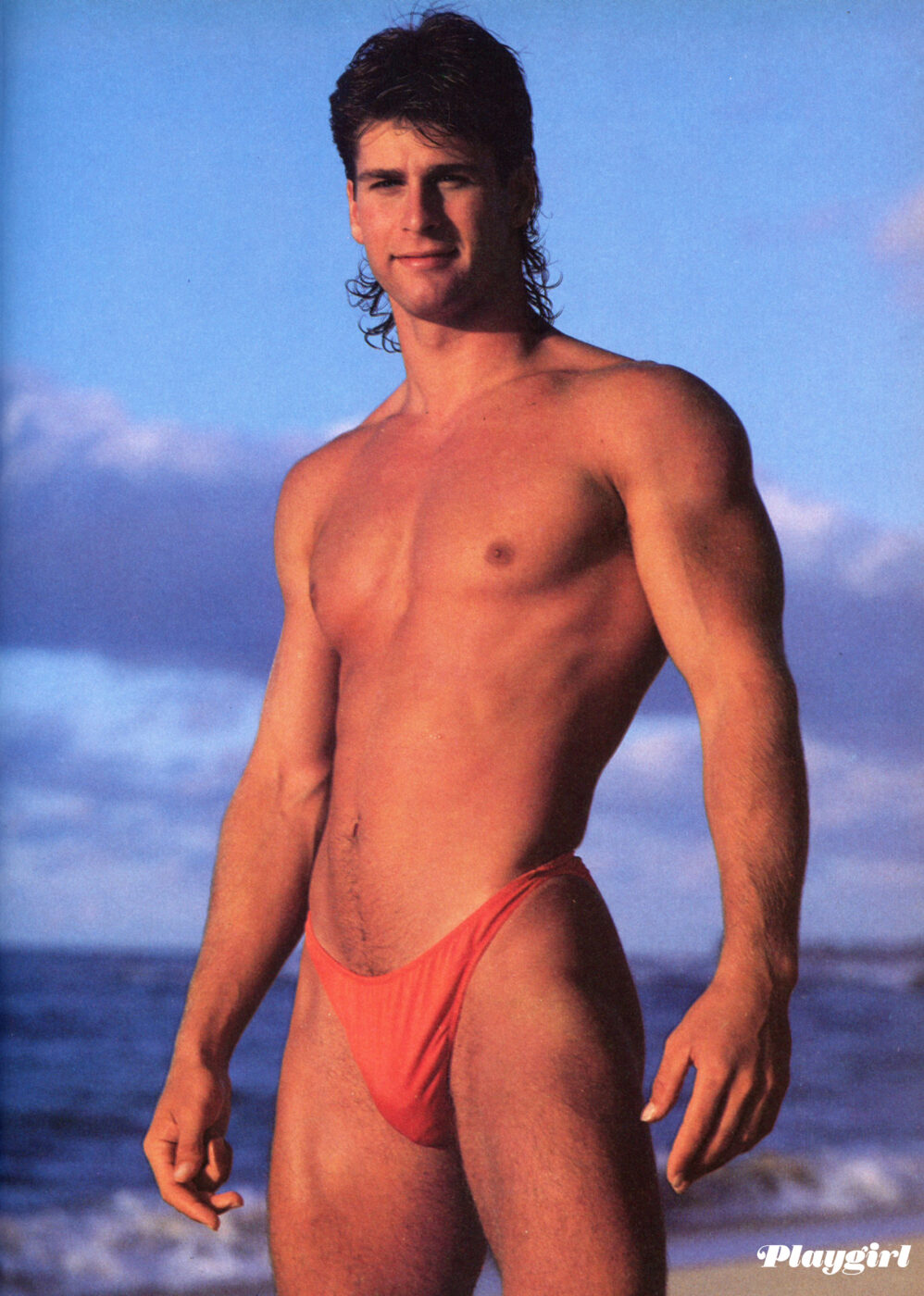 “The awe surrounding the penis in a patriarchal culture,” observes Peter Lehman, “depends on either keeping it hidden from sight (…) or carefully regulating its representation, as the pornographic film does,” with its emphasis on the impressive penis. Beginning in the 80s, Playgirl found it easier to cast its centerfolds and its ‘discoveries’ among the porn stars of the day –straight, gay and gay-for-pay. All endowed, all available: Gene Carrier in the September 1980 issue (better known as Johnny Harden), Rhett Routley in December 1985 (aka Jeff Quinn), Darren Culmar (aka Steve Hammond) and Mike Stone (aka Vinnie Marino) both in February 1988, Rocco Siffredi in December 1990…