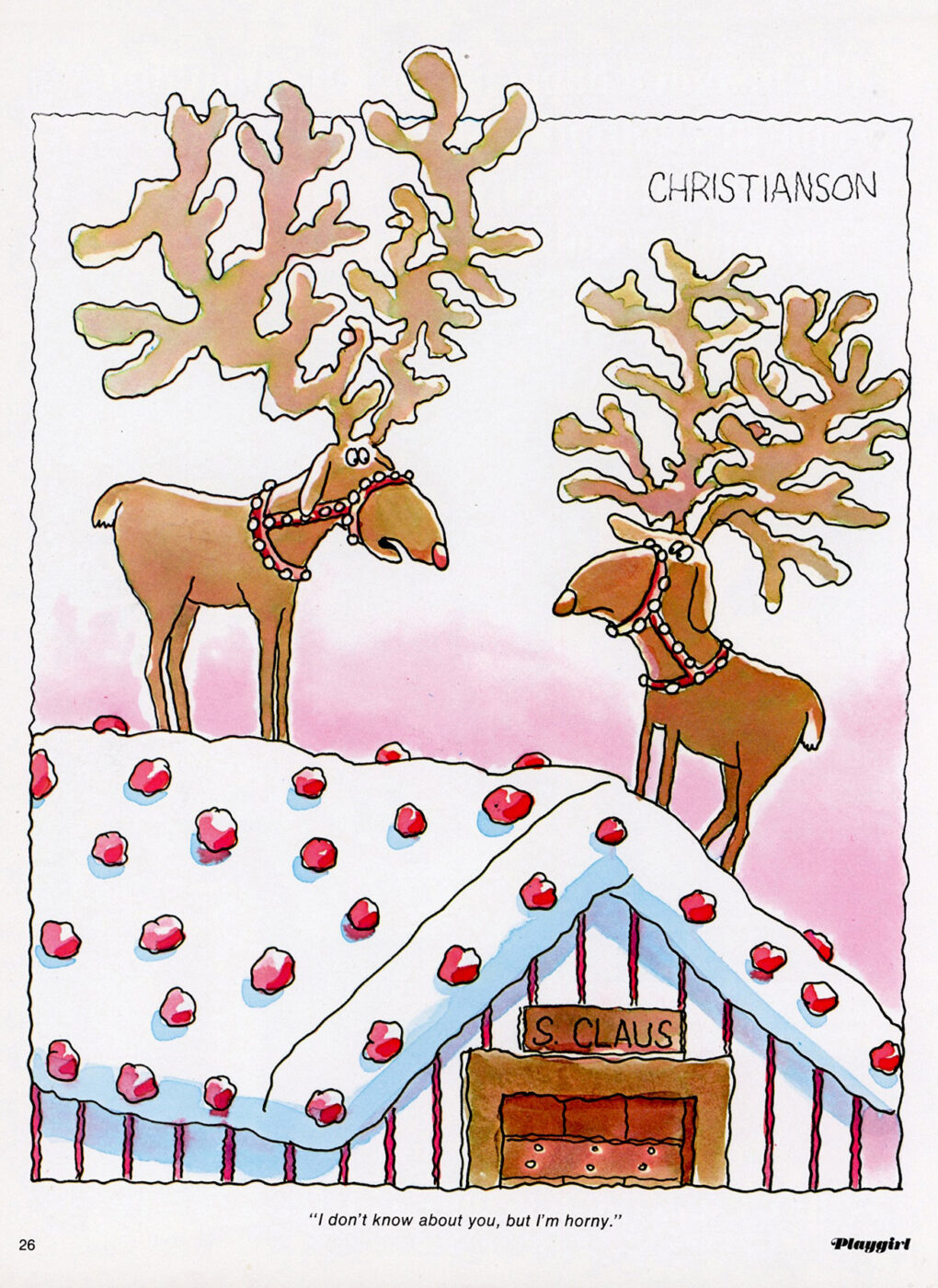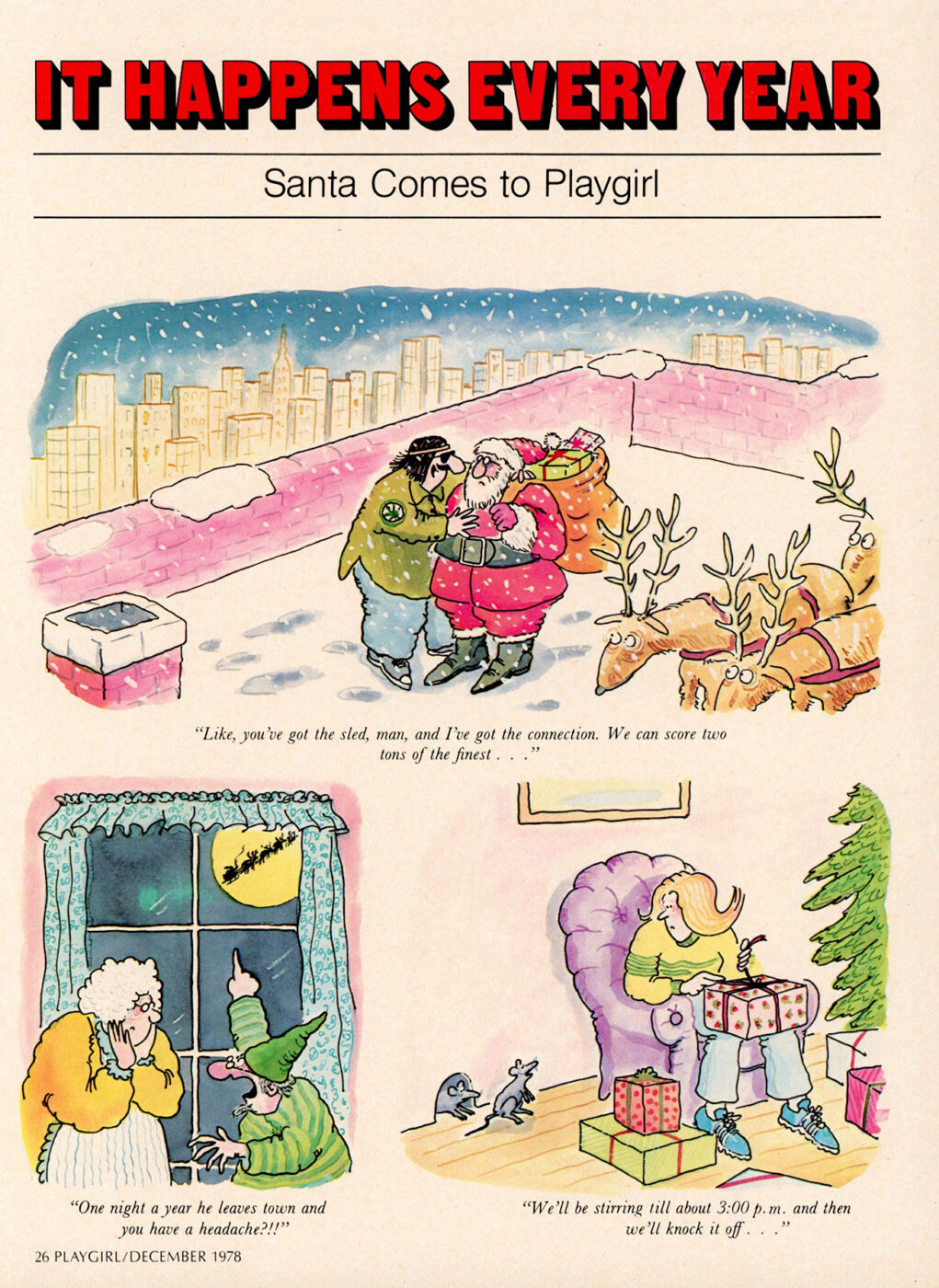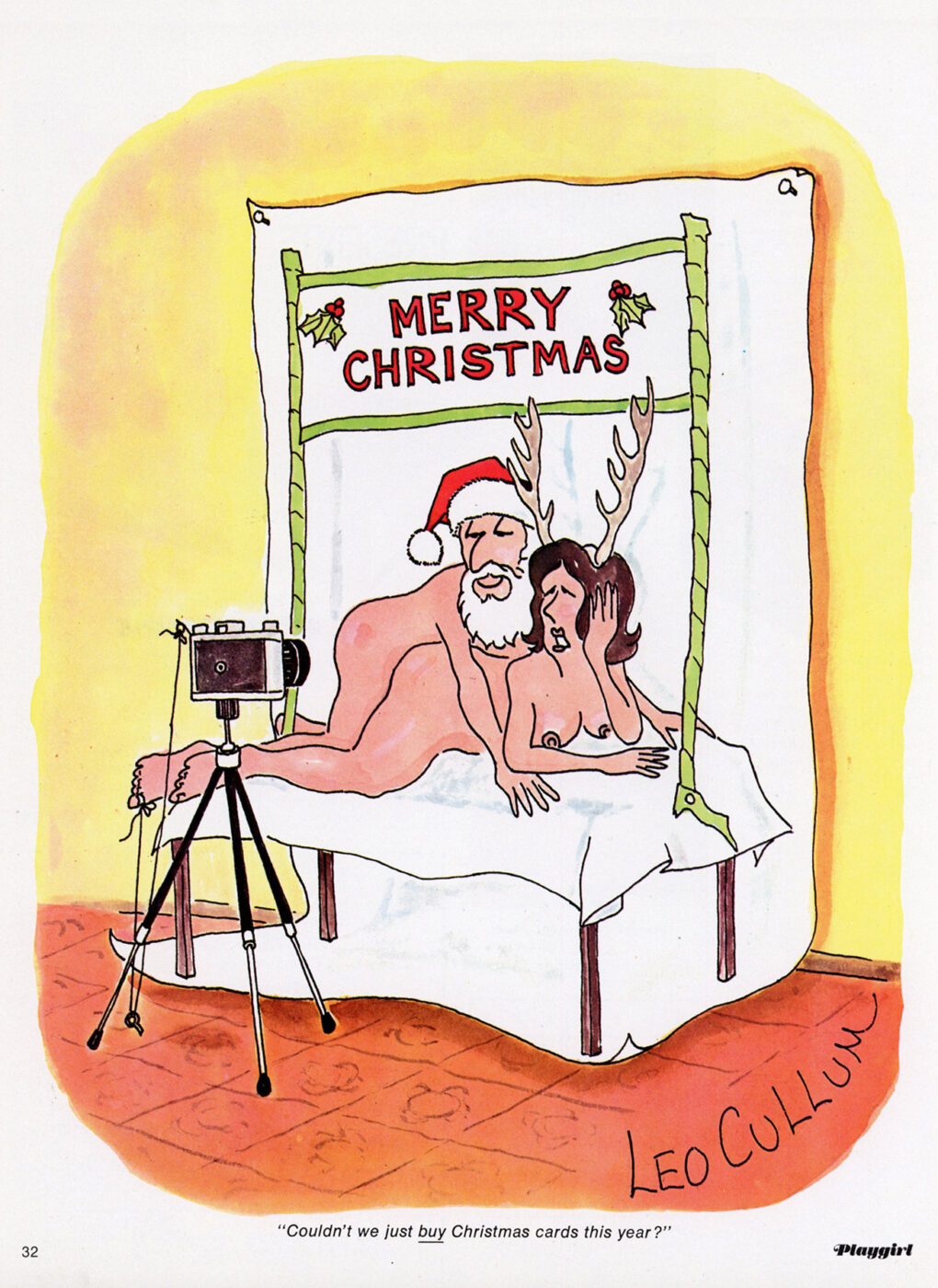 Leave it to Playgirl magazine to poke fun at the holidays. Funnies and satires in the 70s didn’t spare anything: Not Santa, not Mrs. Claus, not their reindeer… Here a few iconoclastic drawings –some by cartoonist Leo Cullen, all amusing (we think).