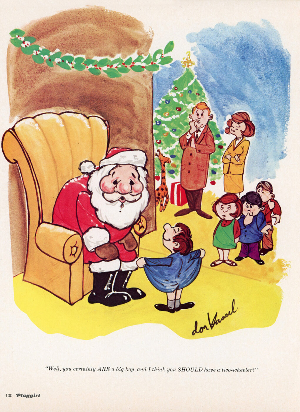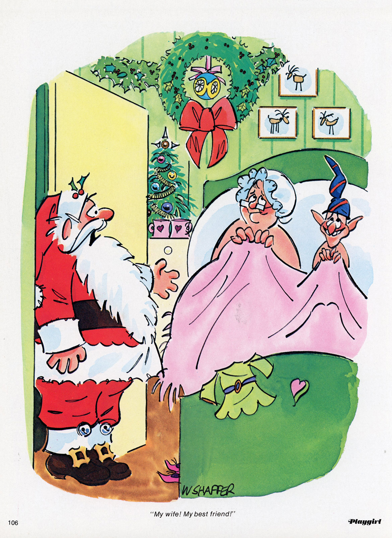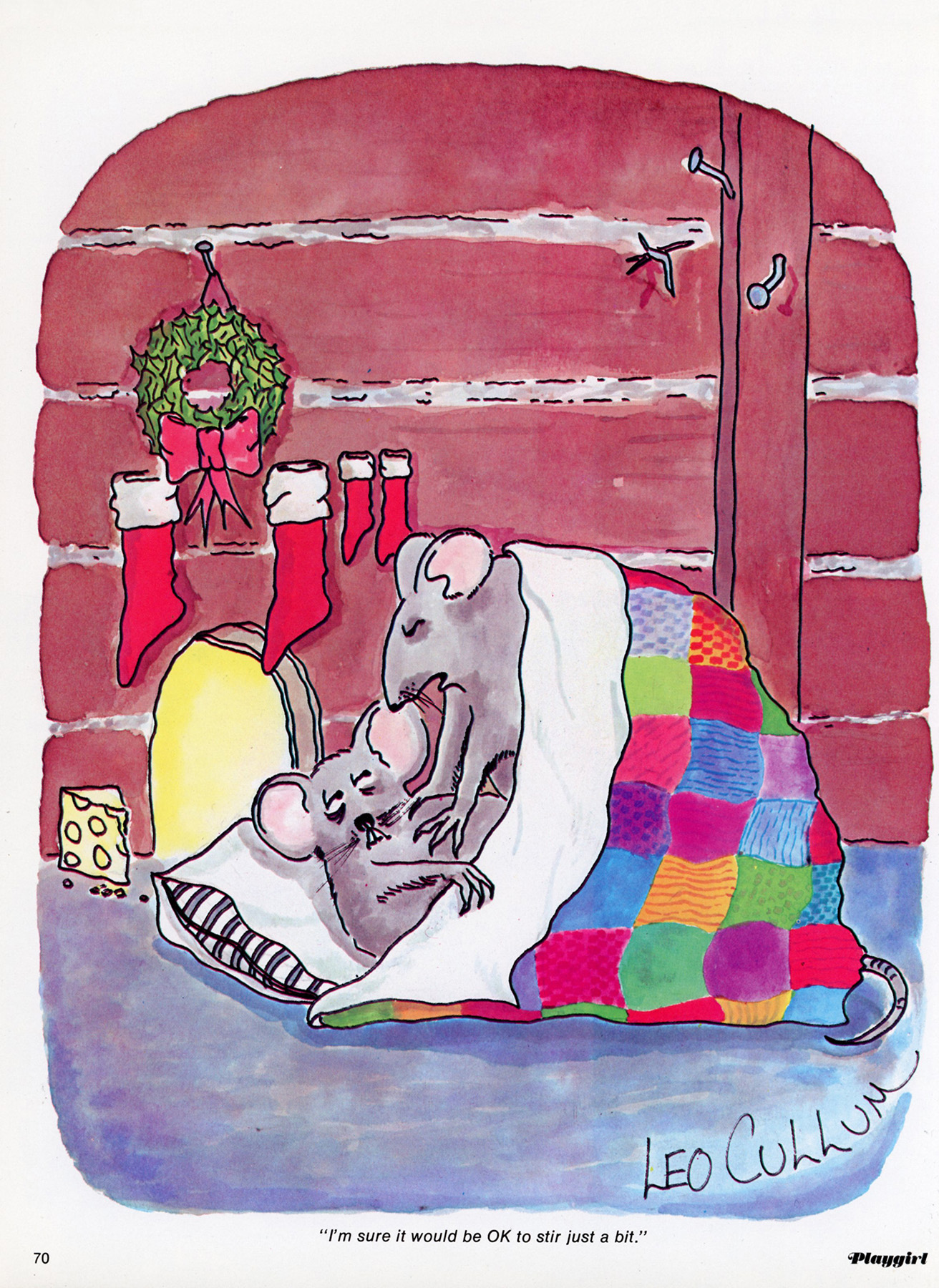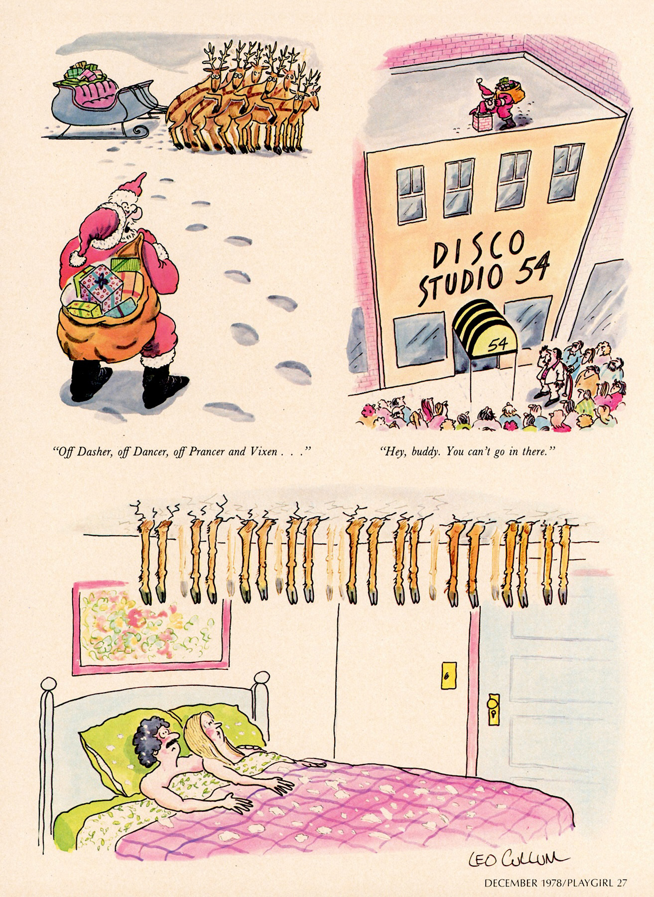 Leave it to Playgirl magazine to poke fun at the holidays. Funnies and satires in the 70s didn’t spare anything: Not Santa, not Mrs. Claus, not their reindeer… Here a few iconoclastic drawings –some by cartoonist Leo Cullen, all amusing (we think).