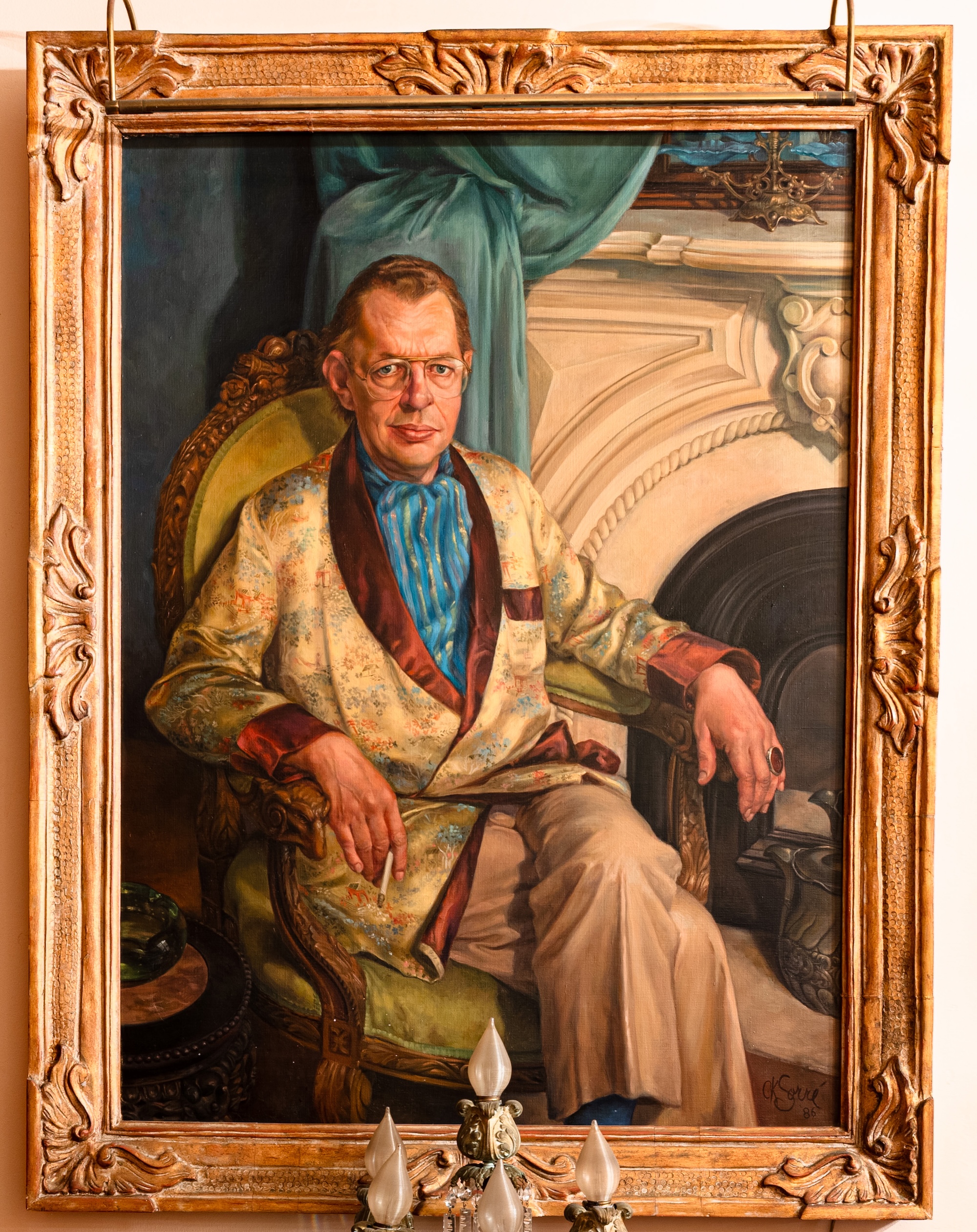 That’s an interesting thing because this is the front parlor of the house. And normally in a front parlor, you would have a portrait or a great photograph of wedding pictures, husband on one side, the wife on the other. So, we decided at that time, why not have two men? It’s always shocking when people come in here and they see two men on either side of the wall. And these paintings were done live. I stood at that mantel right behind you. And Michael sat in this chair here, in the back parlor.