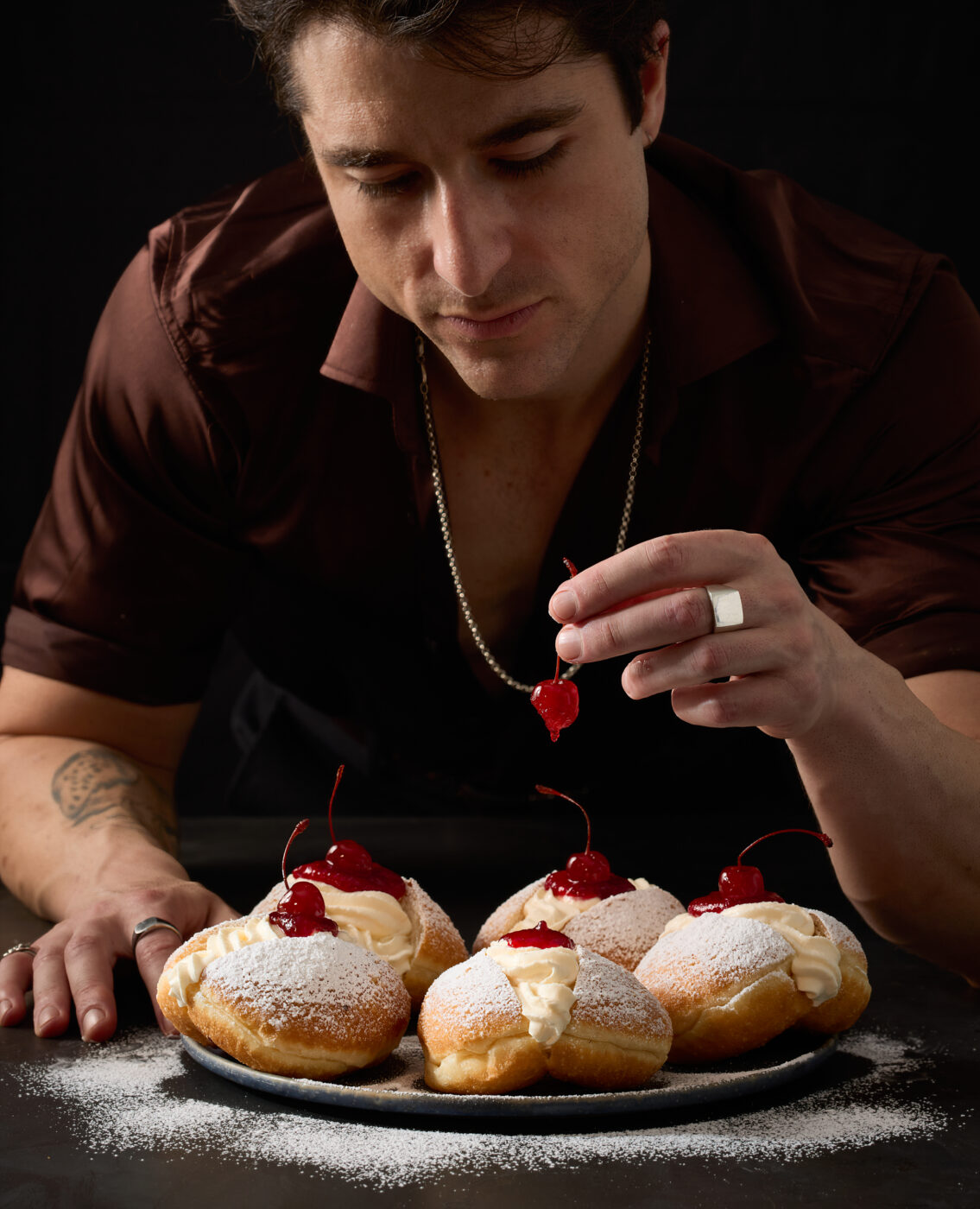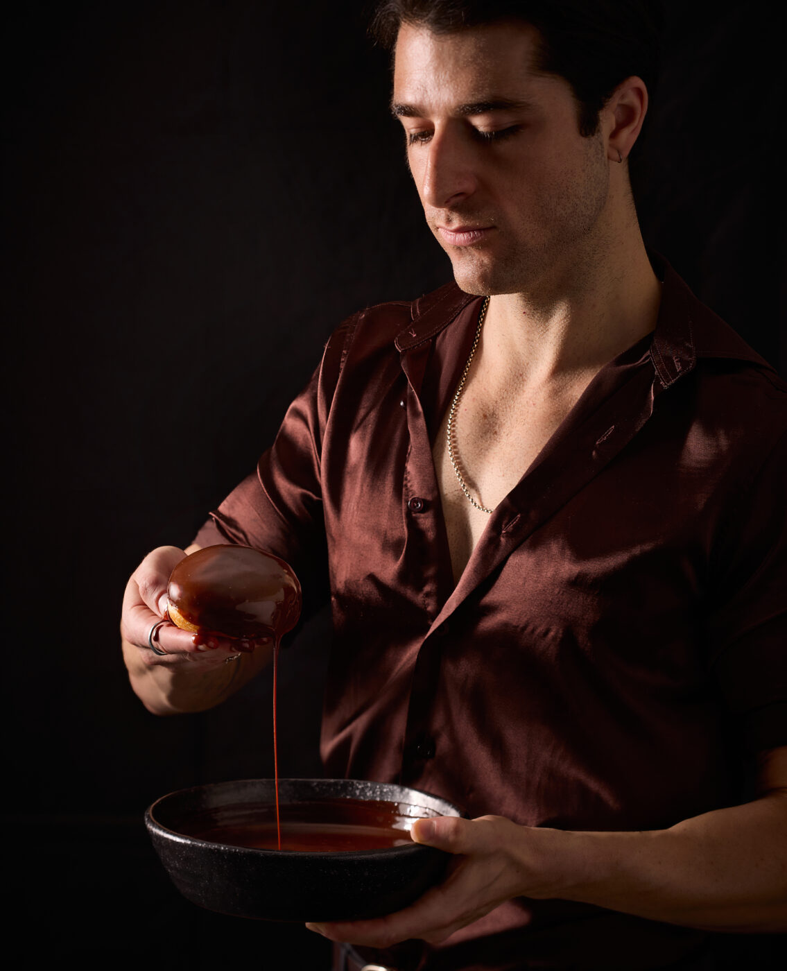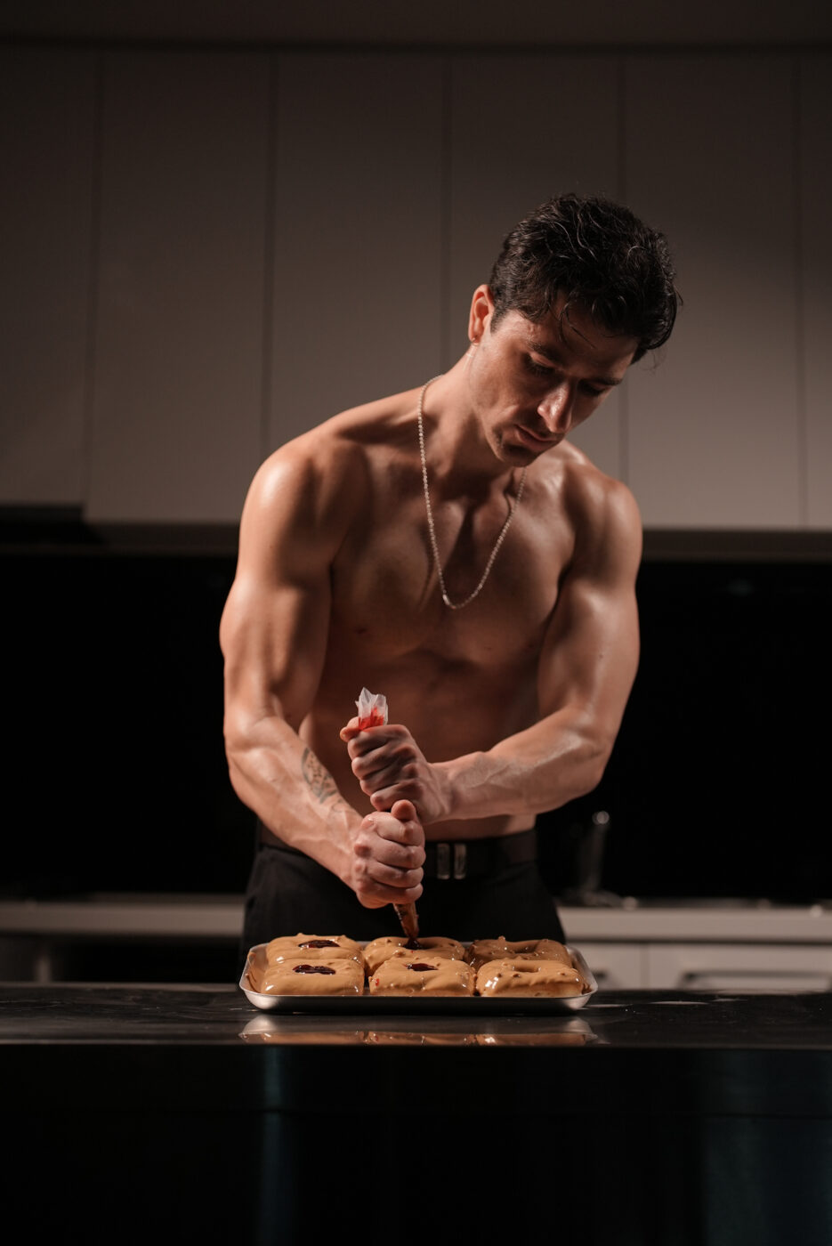 ‘Food porn’ doesn’t always imply a connection food/sexuality. It does in Anthony’s cookbook. With playful chapters like “Foreplay” or “Decadent Desires” and alluring recipes like “My Pleasure Bombs,” or “Sweet Sin Cruller.” It does in his wild cooking videos, which marry stunning cinematic visuals (slo-mo, extreme close-ups and quick cuts) with a hot body (often shirtless) and cheeky, erotic symbolisms. Take these sexy videos on The Donut Daddy’s Instagram page: in his “Panettone” reel, Anthony doesn’t just knead dough, he massages and spanks it like two butt cheeks first, two tits then. He sensuously drips honey into it, fingers a (obviously yonic) yolk, shuts the oven door like he’s ‘humping’ it. In the “Apple streusel” reel, he scoops out the core of an apple and penetrates it with his finger; licks a block of butter, cracks eggs on his chest and caresses the (very phallic) blender… Over the top? Perhaps, but always with humor.